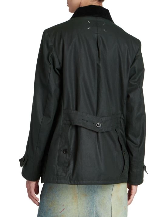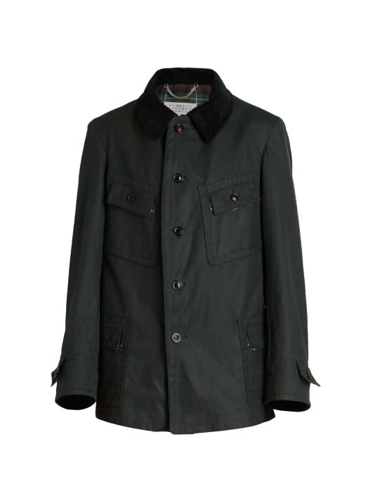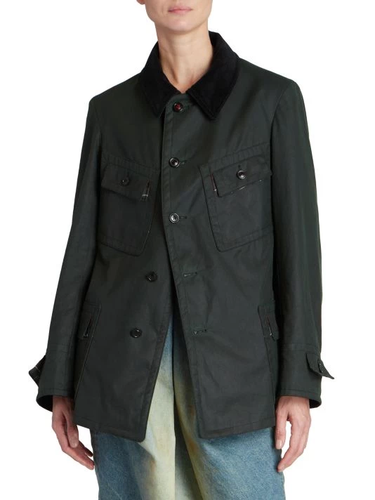 Cut in an oversized silhouette, Maison Margiela’s sports jacket is elevated by contrast button closures and dimensional topstitching. A corduroy point collar elevates the timeless look.