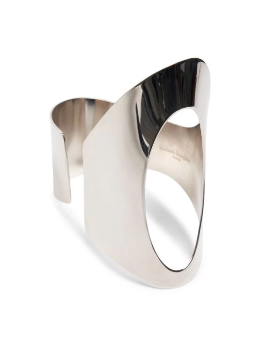 Crafted of sleek, silvertone brass, this cuff features a futuristic design with smooth edges and an asymmetric silhouette.