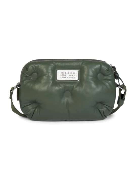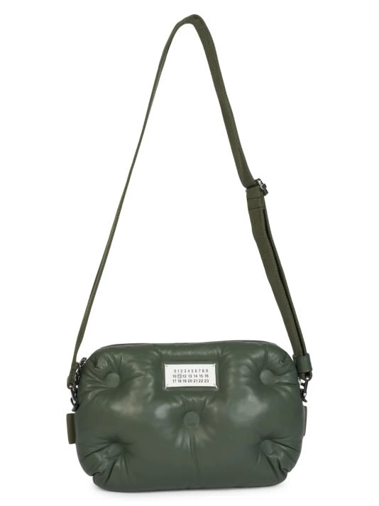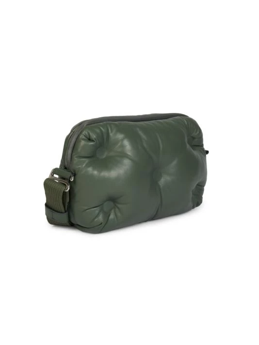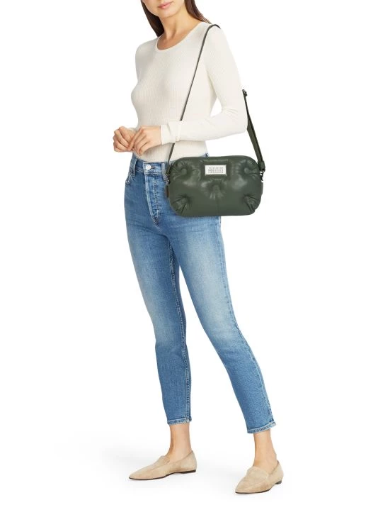 This puffer crossbody bag features a top zip closure and interior zip pocket.