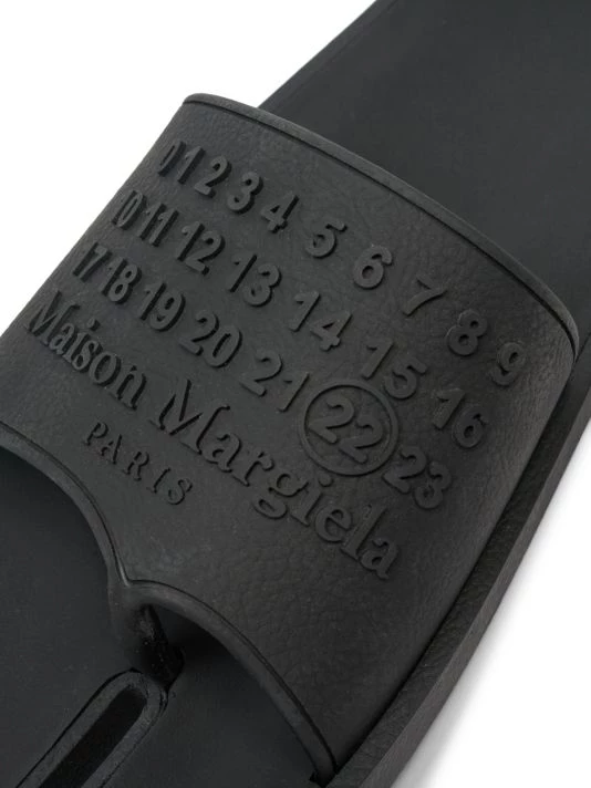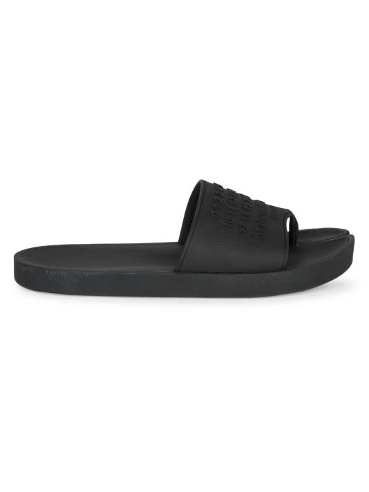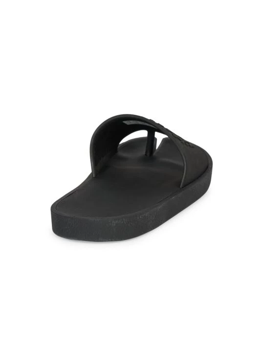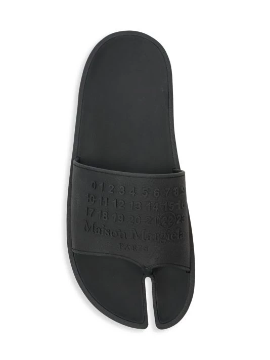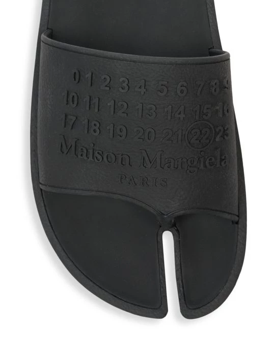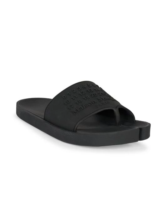A stylish pair of rubber slides with split toe detail and tonal graphic.