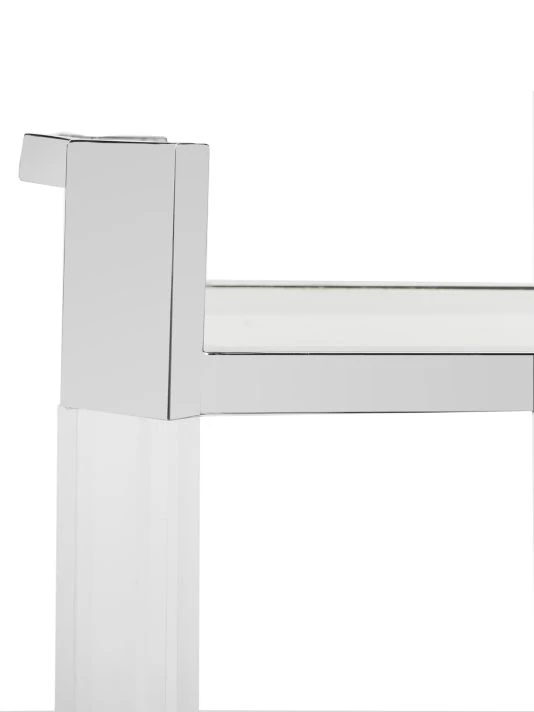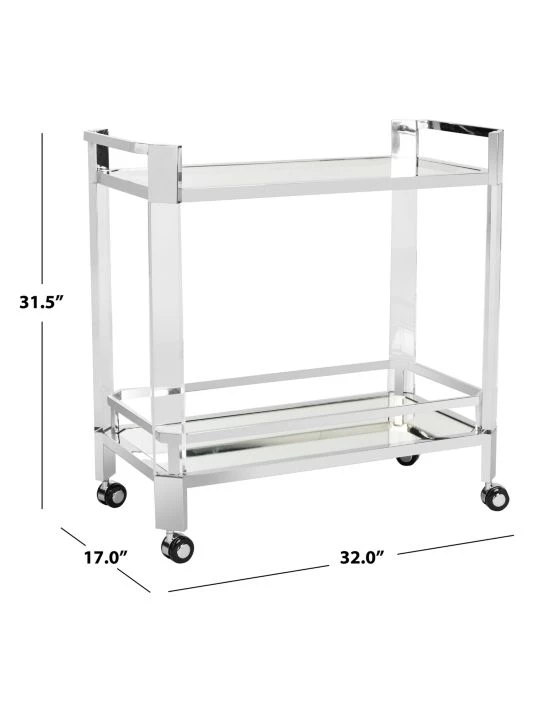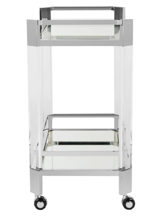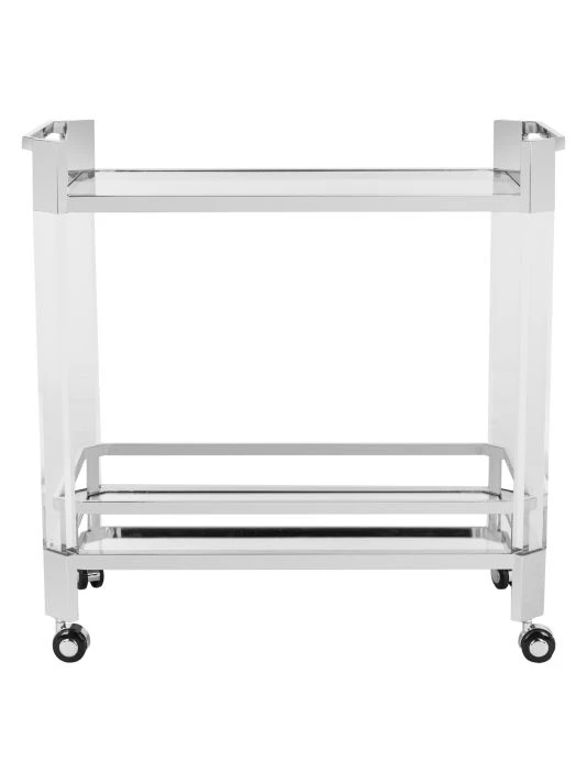Designed to recall London’s infamous art deco hotel, this contemporary glass bar trolley raises the bar in any room. Its two acrylic, glass and mirrored tiers feature polished stainless steel detail. Its ample handles make transporting cocktails a breeze.
